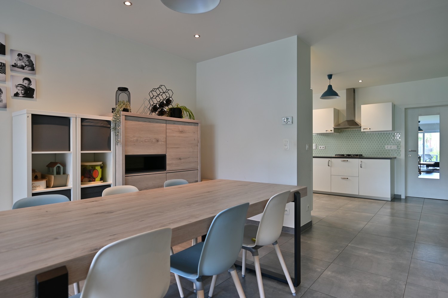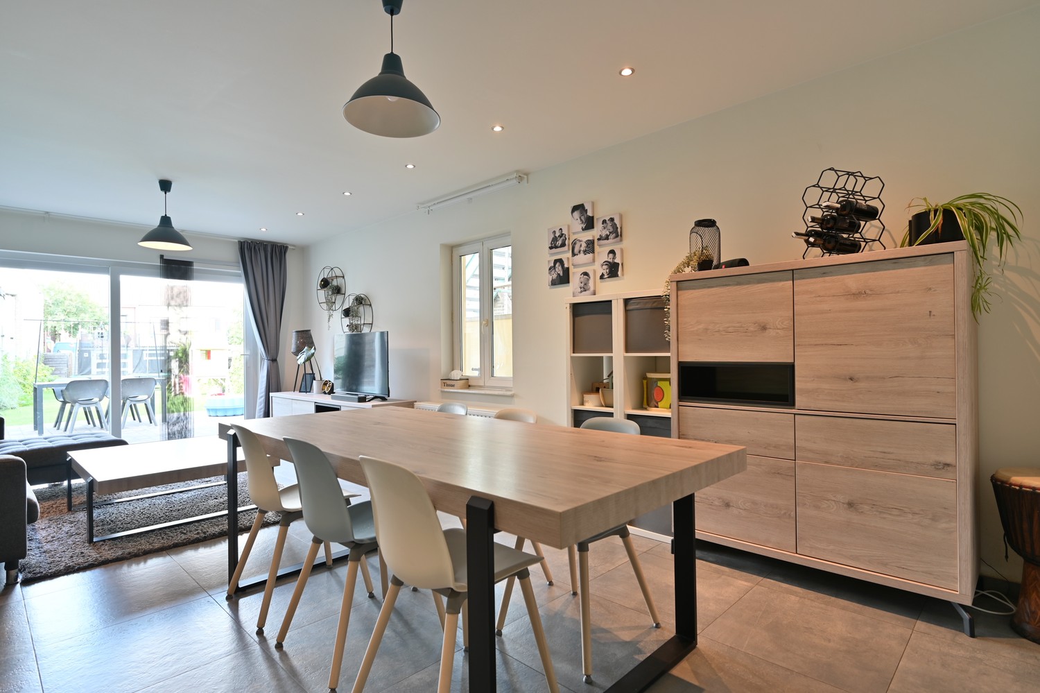 - Ruime, lichtrijke woonkamer met keramische tegelvloer en groot schuifraam naar de diepe achtertuin