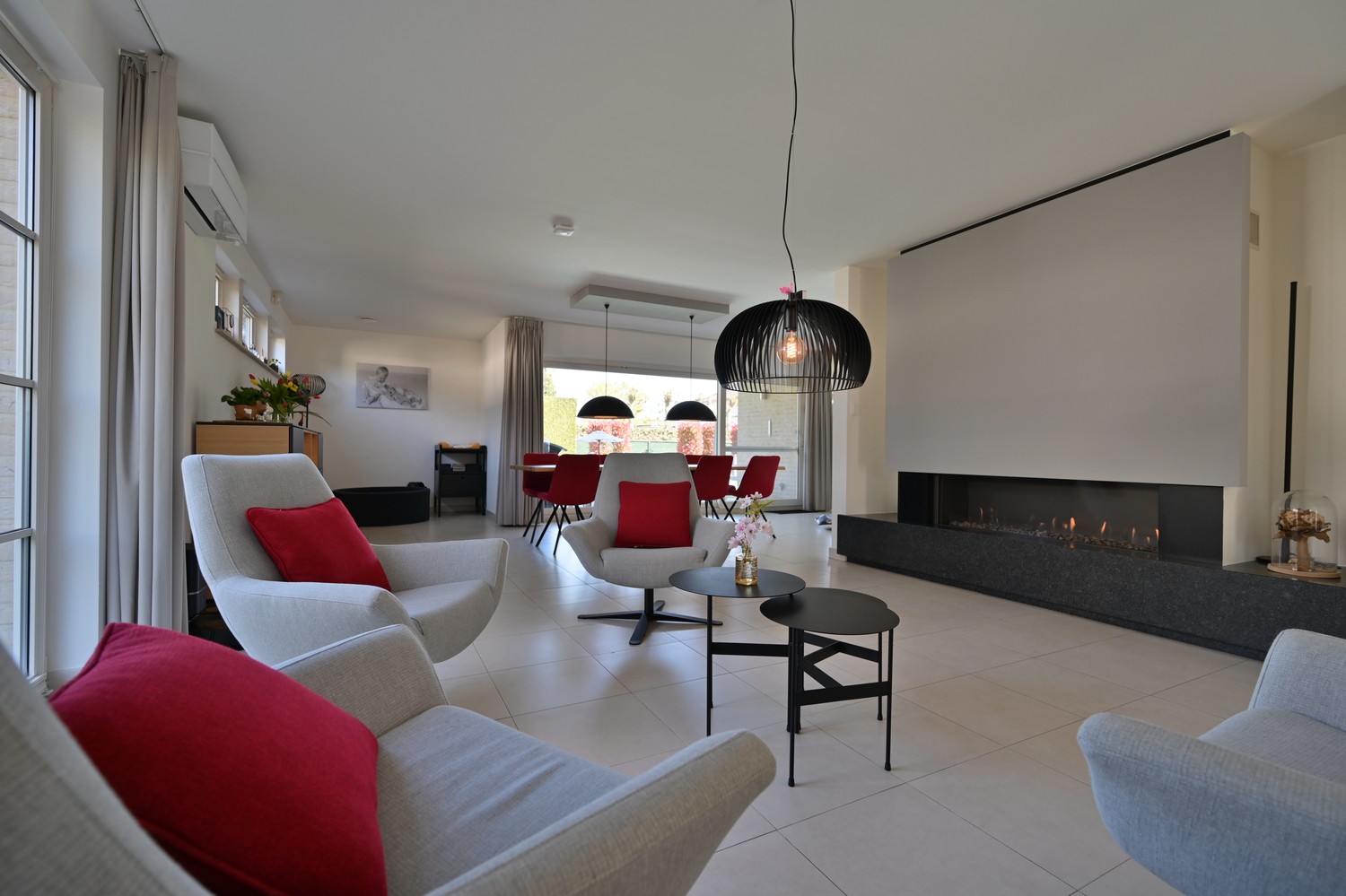 Via een stijlvolle dubbele deur opent zich de leefruimte, waar een warme zithoek met brede gashaard naadloos overvloeit in een ruime eetkamer met zicht op het terras en de tuin. De aansluitende keuken vormt een echte eyecatcher, met een centraal kookeiland, granieten werkbladen en hoogwaardige toestellen van AEG. Vanuit de keuken geniet u van een prachtig zicht op het zwembad en de tuin.