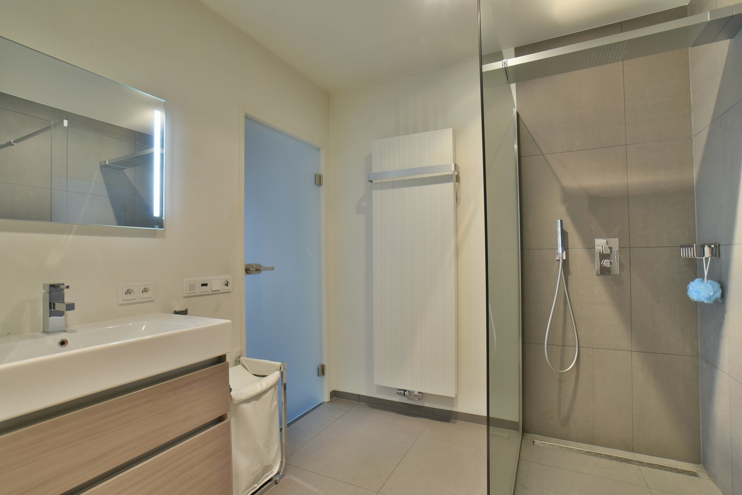 - Luxe badkamer voorzien van glazen inloopdouche met regendouche, hangtoilet en meubel met 2 wastafels