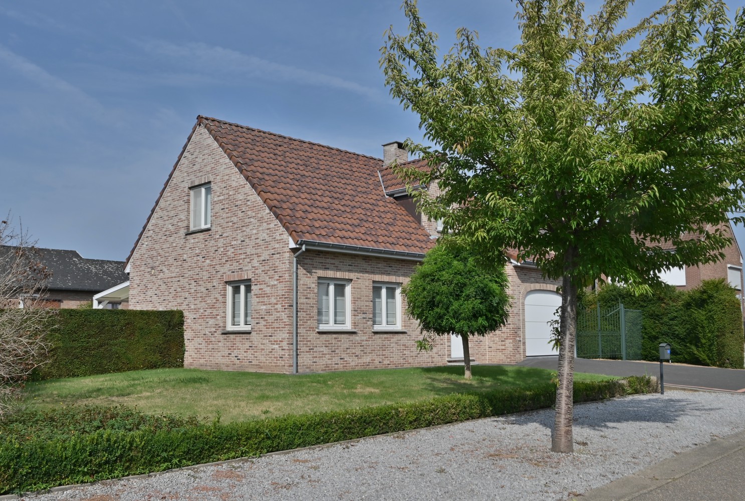 - omheind tuin met brede toegangspoort rechts van de woning