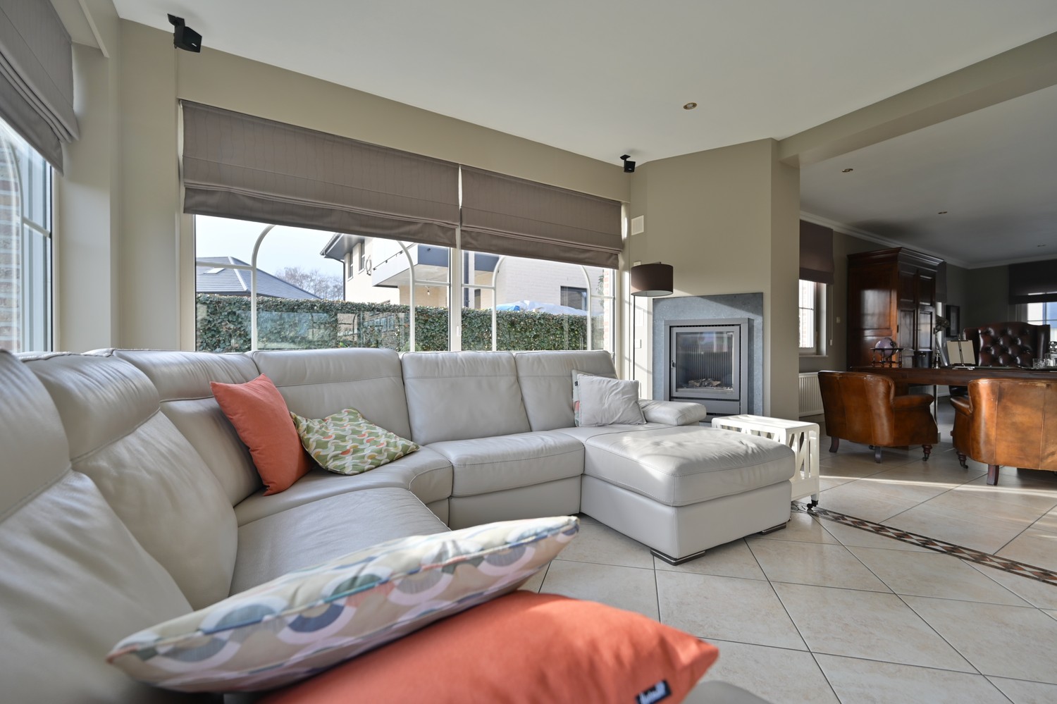 - Ruime L-vormige living met grote raampartijen aan de achterzijde (tuincontact), ingebouwde gashaard