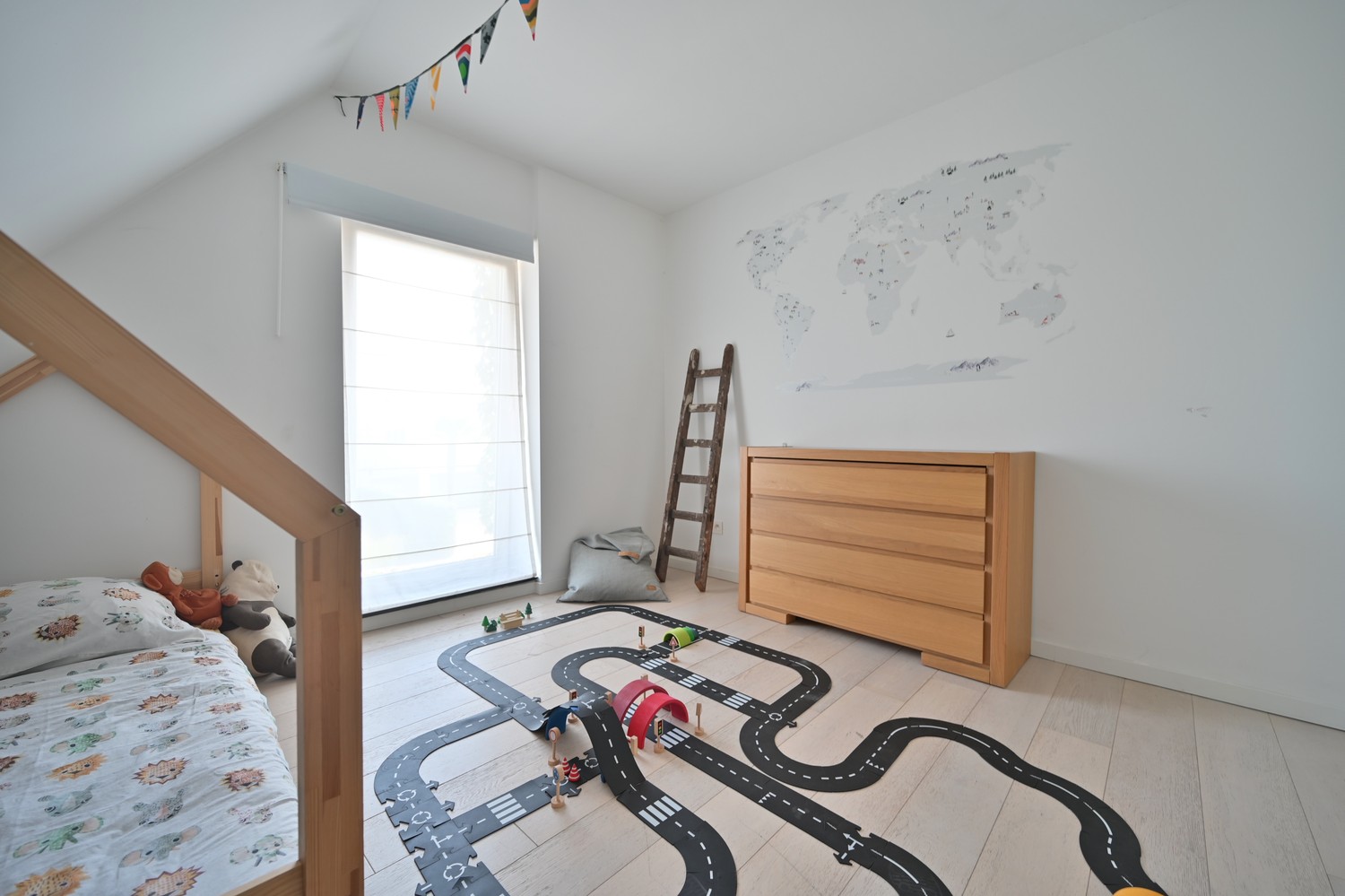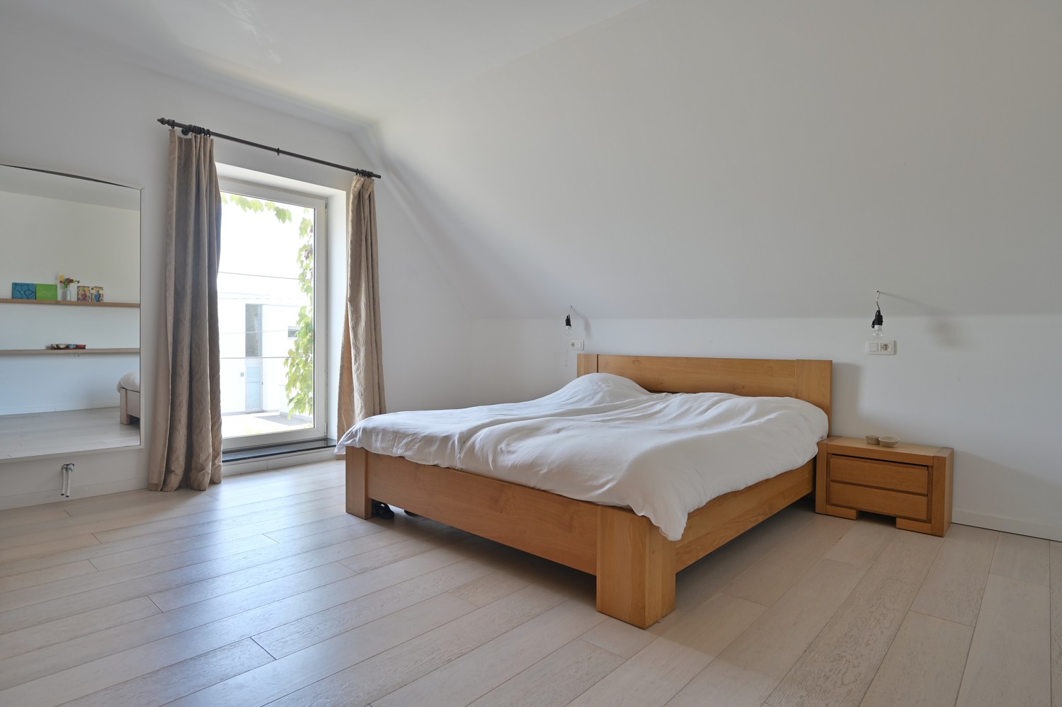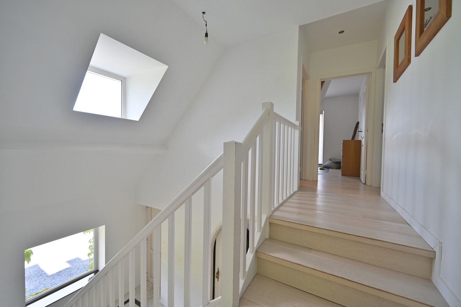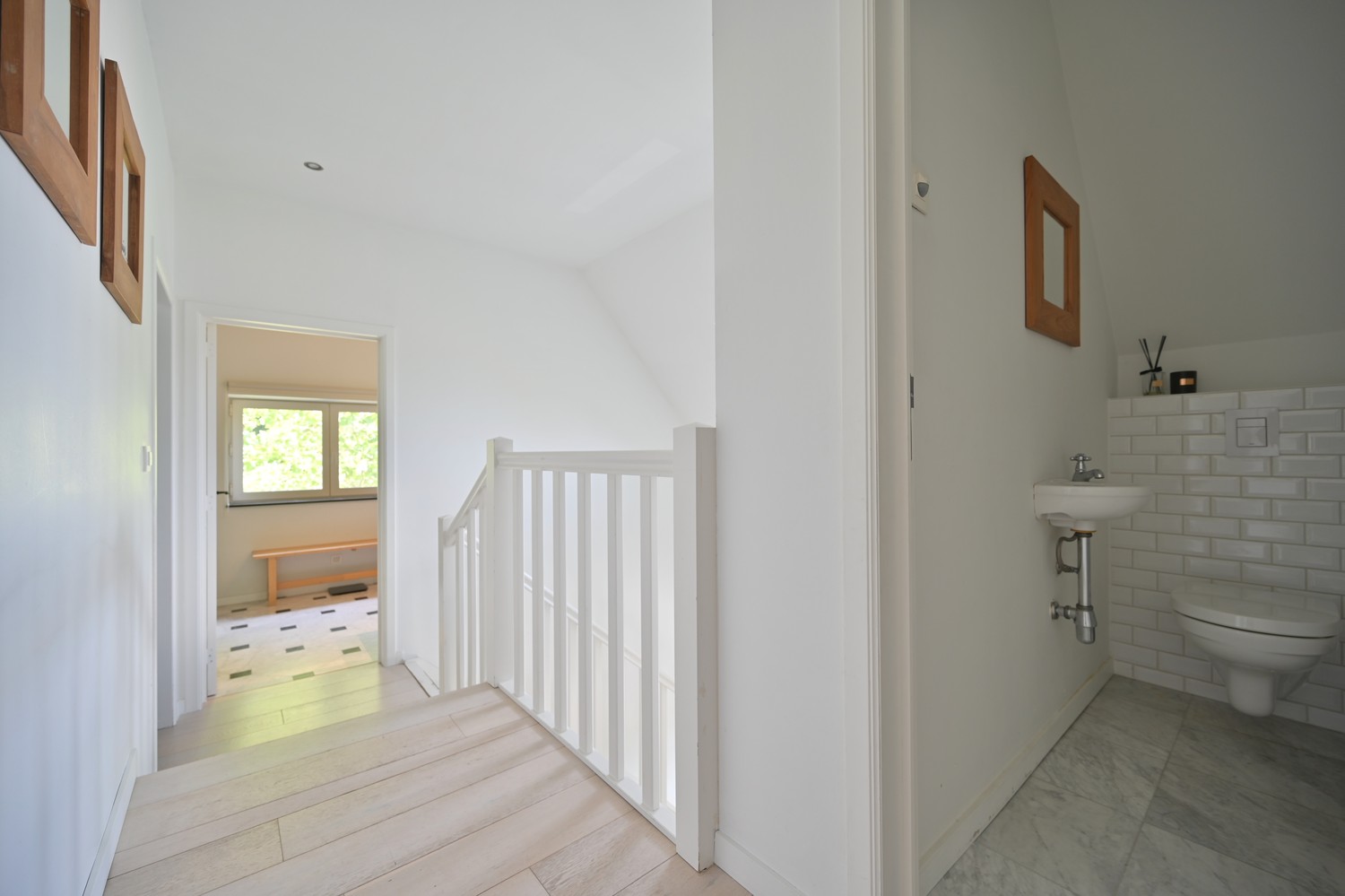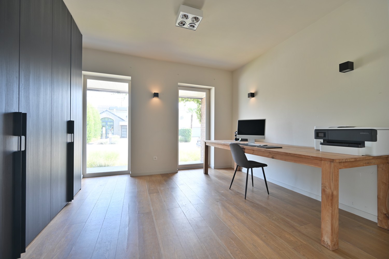 De woning verwelkomt u met een stijlvolle inkomhal, die toegang biedt tot een aparte kantoorruimte. Deze ruimte kan perfect worden ingericht als thuiskantoor of als extra slaapkamer op het gelijkvloers, wat de woning bijzonder flexibel maakt. Het hart van de woning is ongetwijfeld de ruime leefkeuken, waar veel lichtinval en optimaal tuincontact zorgen voor een open en warme sfeer, uitkijkend op een gezellig terras dat sfeervol wordt overschaduwd door platanen. Hoogwaardige materialen zoals eiken parket en marmeren vloeren geven de woning een tijdloze klasse, terwijl de vele ingemaakte kasten zorgen voor een praktische en stijlvolle afwerking.