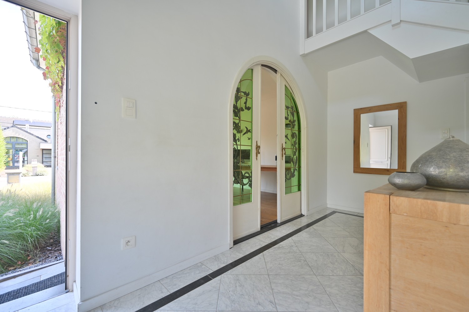 - bureau met parketvloer en maatwerk kastenwand (zwart hout), bereikbaar vanuit de inkomhal middels een dubbele, authentieke boogdeur met glas-in-lood