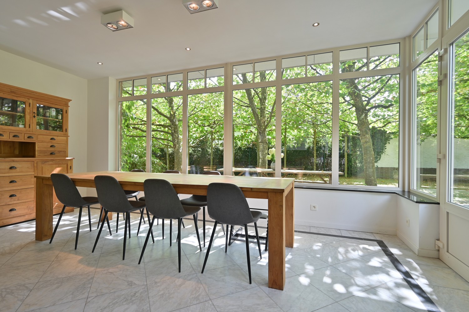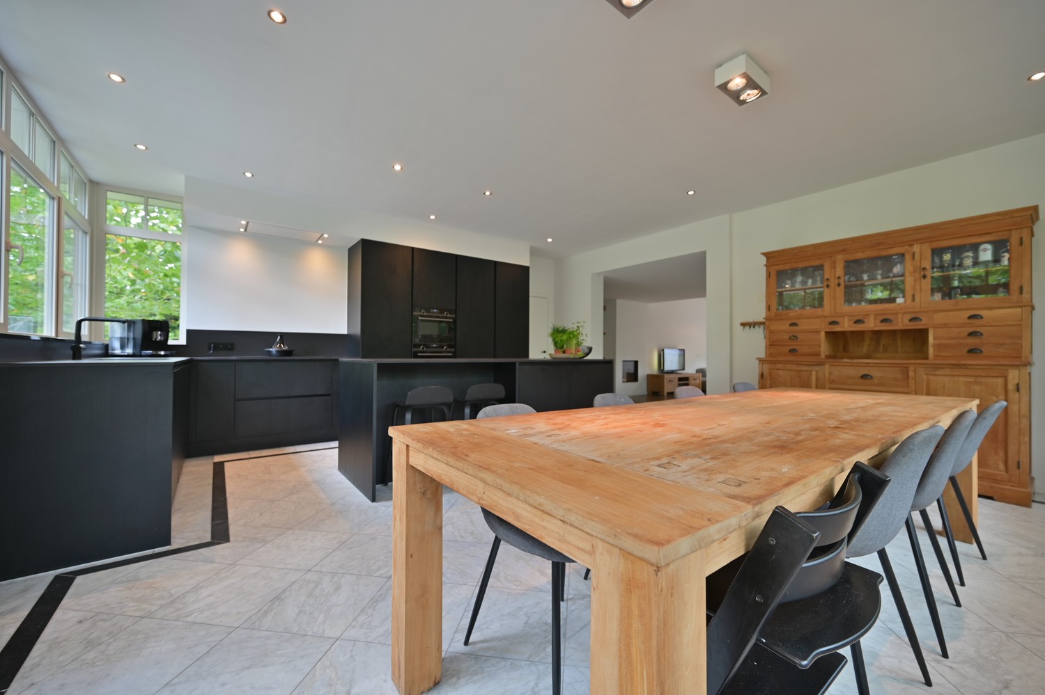 - schitterende aanbouw met open eilandkeuken, eveneens voorzien van de mooie marmervloer, en een optimaal zicht op de tuin en achterliggende bossen