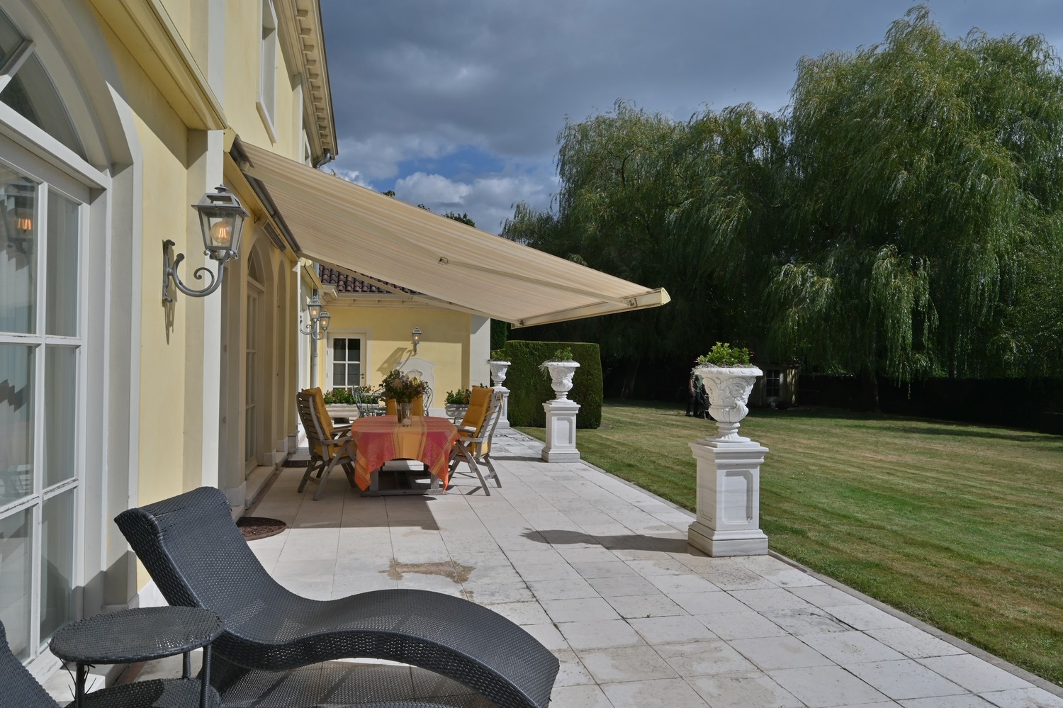 - fraai aangelegde tuin met privacy door hoge haag, gazon, bomen, groot terras met zonneschermen en terrasverwarming