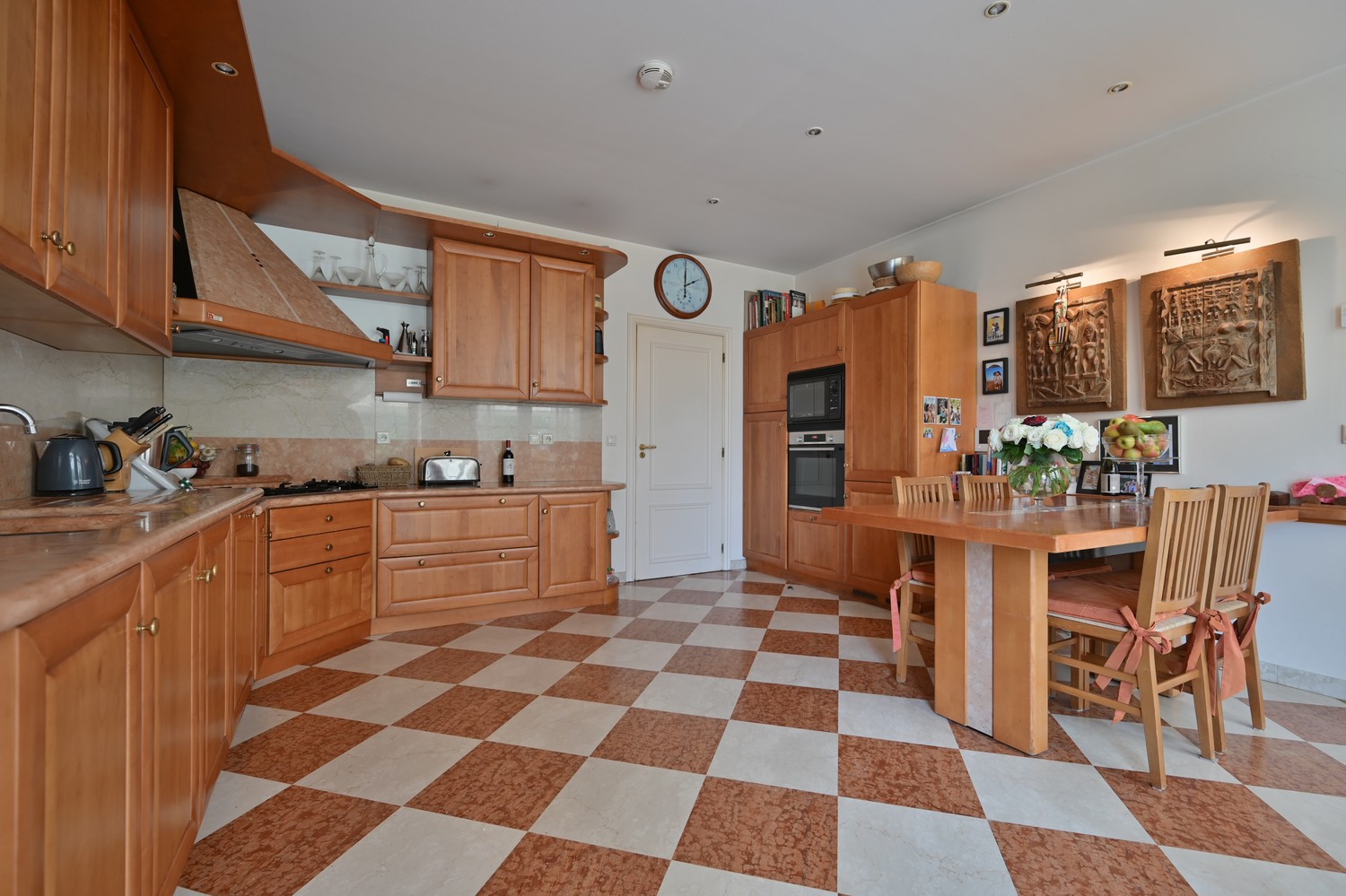 - L-vormige woonkeuken in Italiaans kersenhout, volledig uitgerust met inbouwapparatuur; aansluitend een bijkeuken