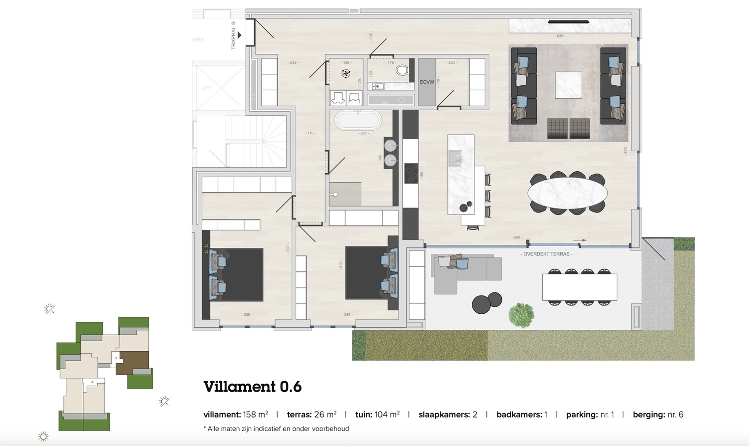 - villament 0.6 - Gelijkvloers - woonopp. 158 m2 - terras 26 m2 en tuin 104 m2 - 2 slaapkamers - 1 badkamer