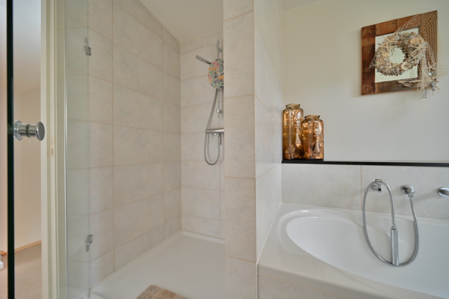 - badkamer 8 m² (tegelvloer) voorzien van meubel 1 wastafel, ligbad, douche, hangtoilet