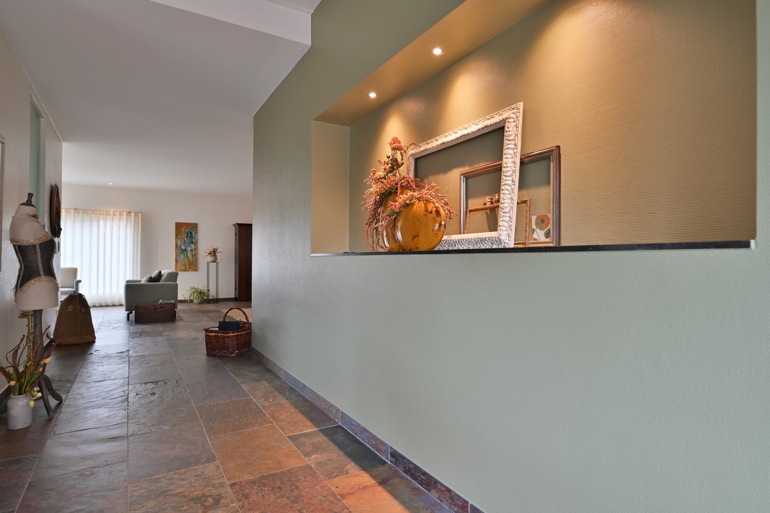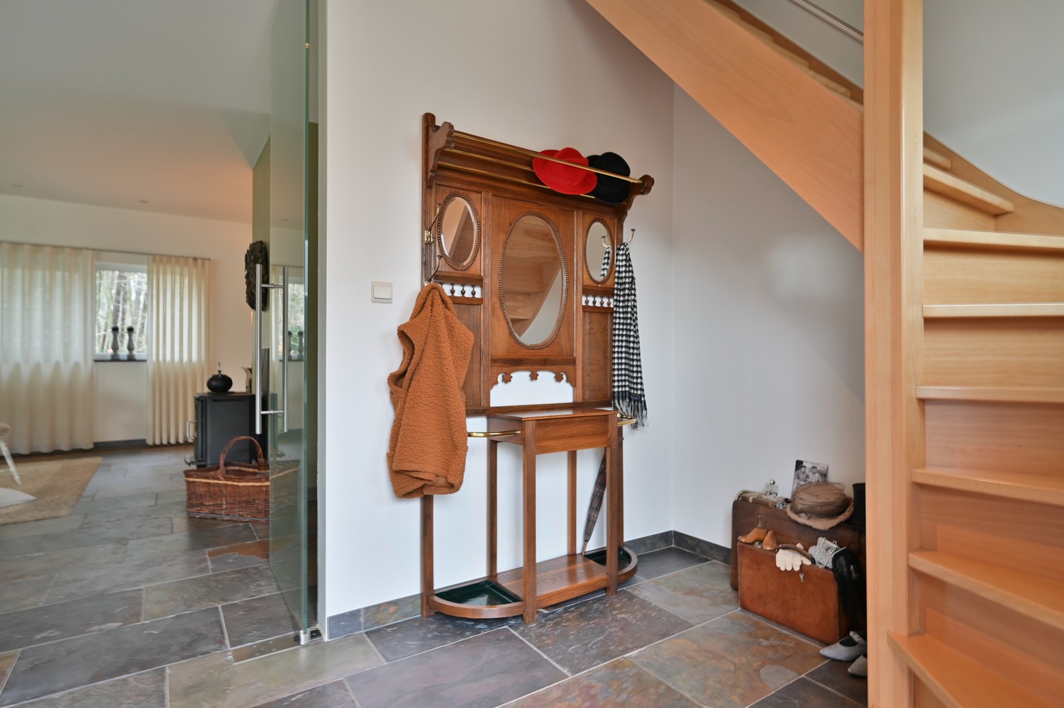 - Inkomhal, met gastentoilet (hangtoilet + stenen blad met wastafeltje)