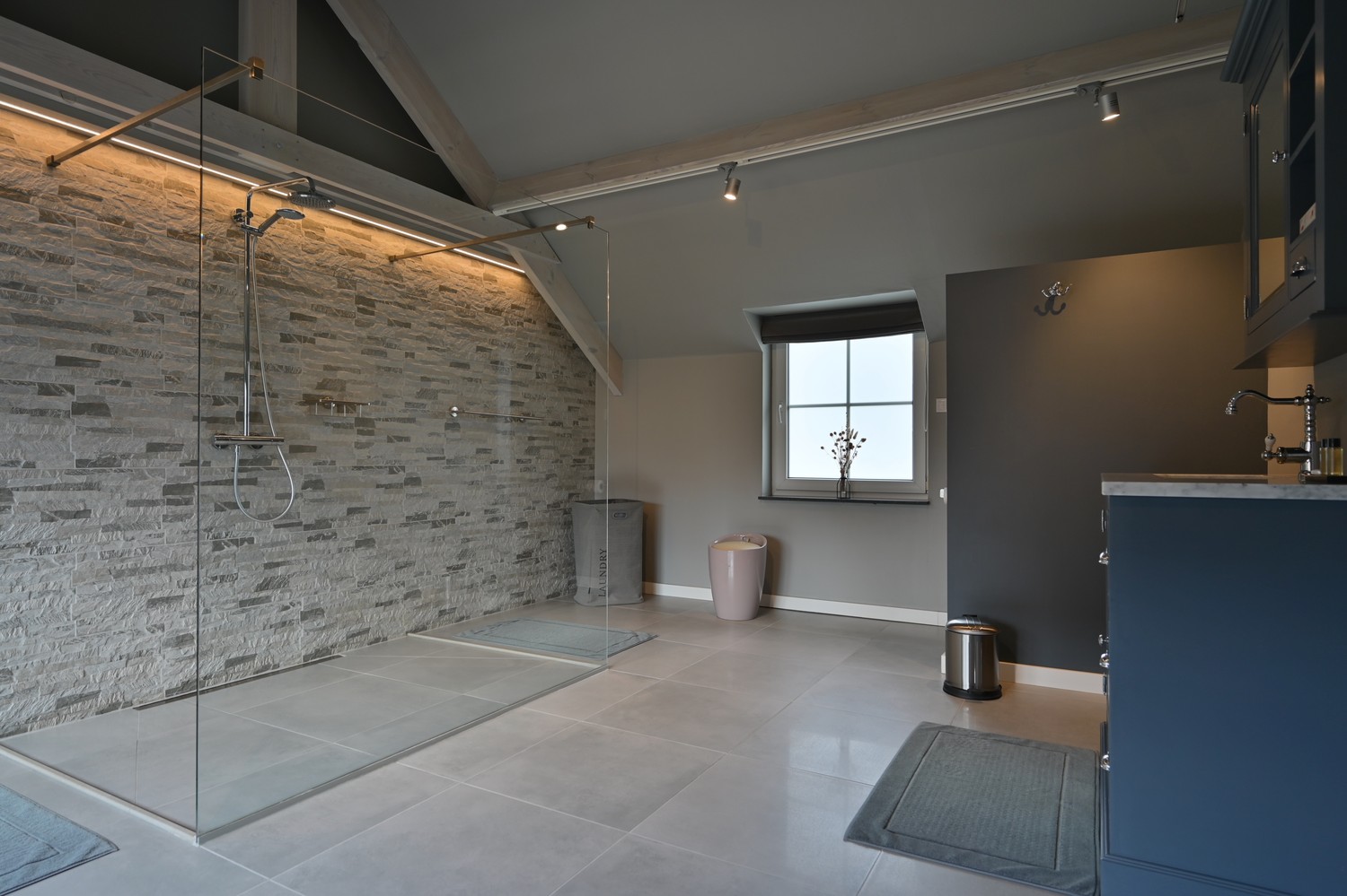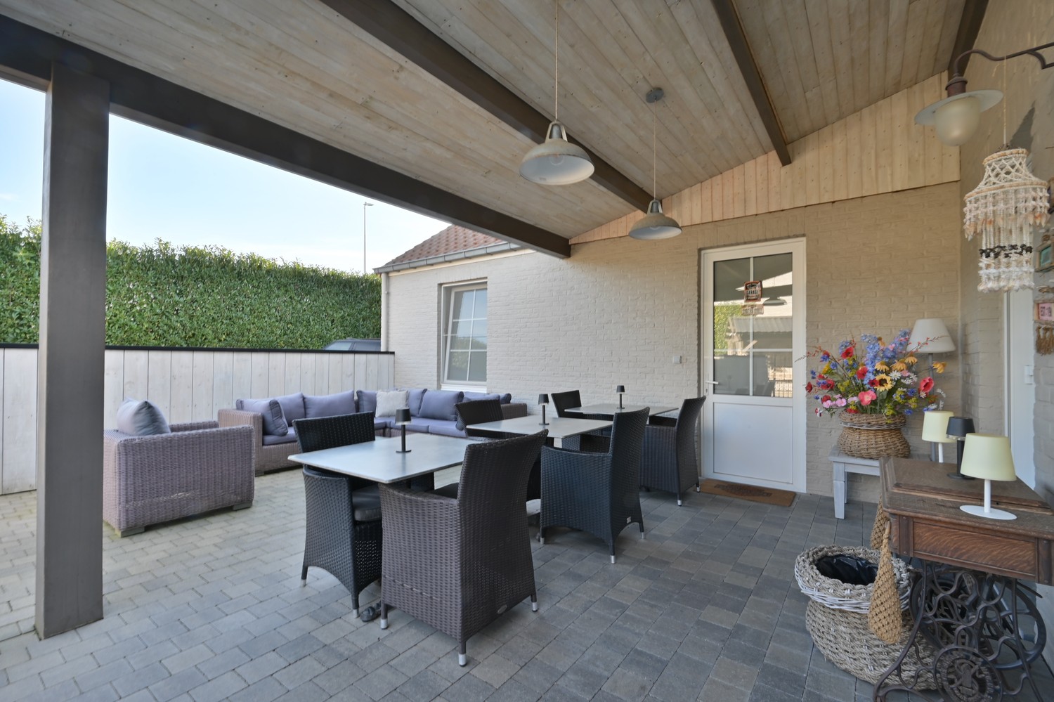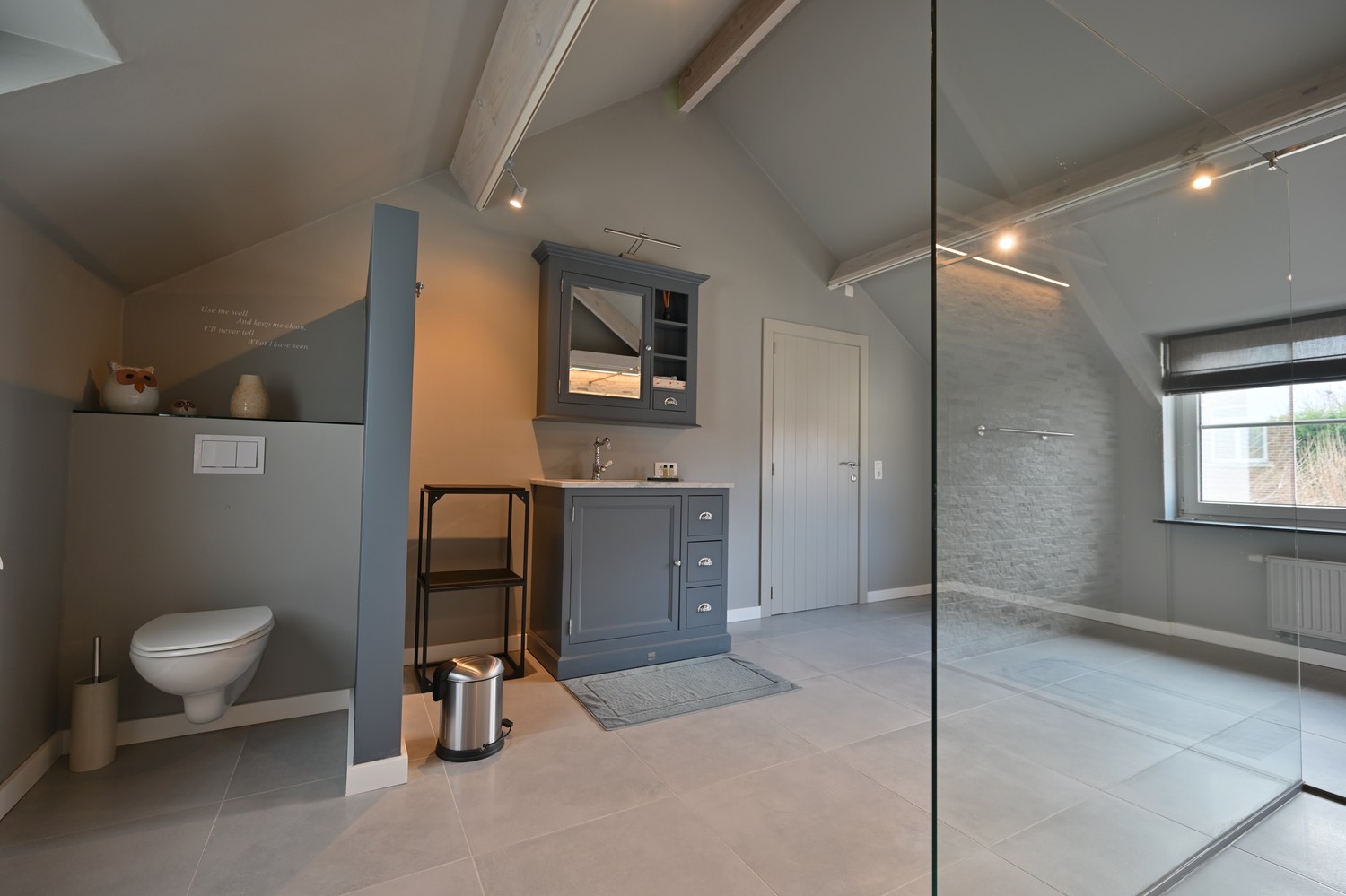 Via de eerste hal met gastentoilet komen we in de zeer praktisch ingerichte keuken met zicht op de koer achteraan. De keuken is afgewerkt met een combinatie van composiet en RVS werkbladen en is volledig uitgerust met hoogwaardige toestellen, waaronder een dubbele Amerikaanse koelkast, een wijnfrigo, een gasfornuis, een vaatwasser, een combi-oven en een Novy dampkap. Vanuit de keuken betreden we via een dubbele zwart stalen glazen deur de ruime leefruimte met een prachtig zicht op het verwarmde zwembad. Aansluitend bevindt zich de zeer royale woonkamer, eveneens toegankelijk via de voorzijde van het perceel. Hier vinden we een apart toilet en een extra polyvalente ruimte van ca. 30 m² aan straatzijde, ideaal als praktijkruimte, kantoor of hobbyruimte. Via een houten trap bereiken we het slaapgedeelte. Onder de dakspanten bevindt zich een sfeervolle slaapkamer met veel lichtinval langs twee zijden. Aansluitend vinden we een prachtig afgewerkte dressing met wollen tapijt en een zeer ruime badkamer met ligbad, inloopdouche, dubbele wastafel en ingewerkte wandkasten. Het geheel wordt vervolledigd met een apart afsluitbaar toilet. De buitenruimte is met dezelfde zorg en kwaliteit aangelegd als het interieur. Aan de achterzijde van het perceel bevindt zich een verwarmd zwembad dat wordt aangedreven door een warmtepomp en uitgerust is met een automatische chloorinstallatie, wat zorgt voor optimaal comfort en eenvoudig onderhoud. Het bijhorende poolhouse herbergt alle technische installaties en biedt extra praktische bergruimte. De voorzijde van het perceel is volledig aangelegd met kleiklinkers en afgesloten met een stijlvolle dubbele smeedijzeren poort, wat zowel privacy als veiligheid garandeert. Naast de ruime oprit bevindt zich aan de rechterzijde een dubbele garage met twee sectionale poorten. Boven de garage is er een zolderruimte voorzien over ongeveer 50% van het vloeroppervlak, ideaal als extra opslag. Bovendien is er een laadpaal-voorziening aanwezig, wat deze eigendom ook toekomstgericht interssant maakt.
