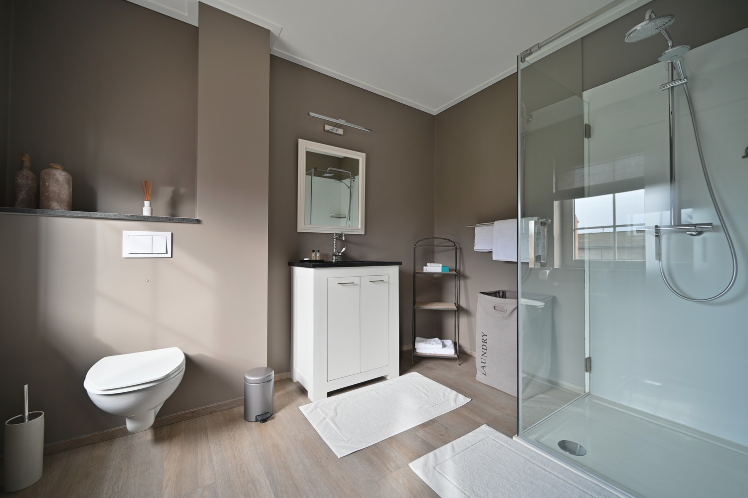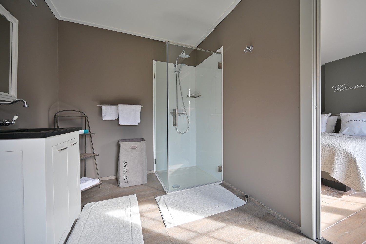 - Vloeren: vinyl-laminaat (gelijkvloers), parket (slaapkamer), wol (dressing), keramische tegels (badkamers)
