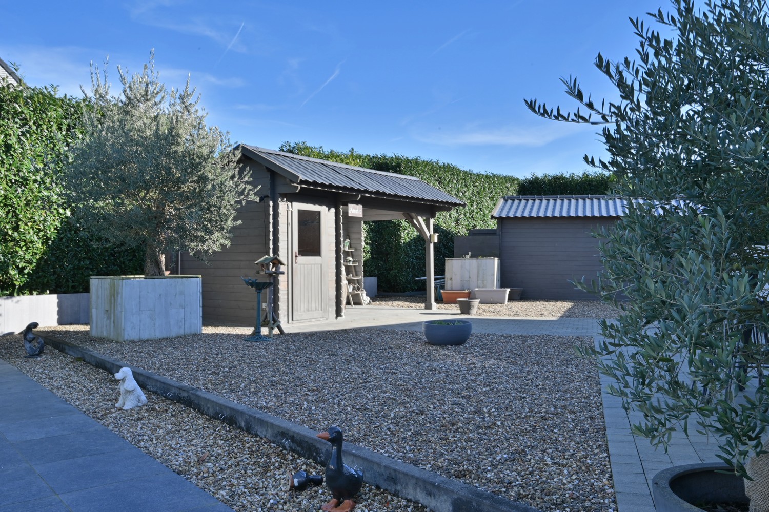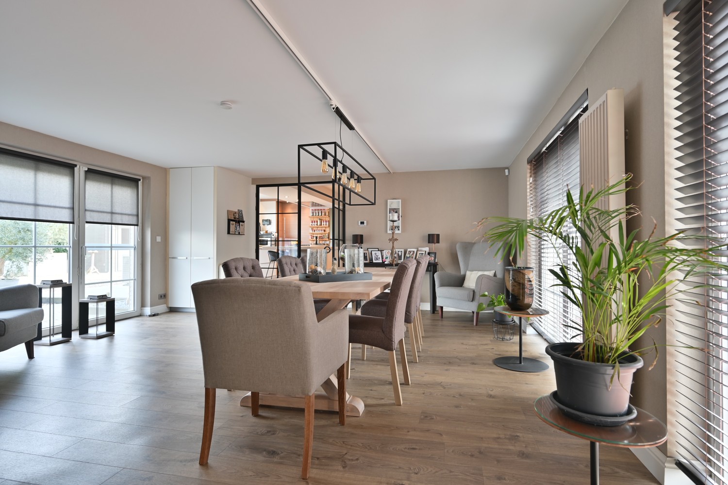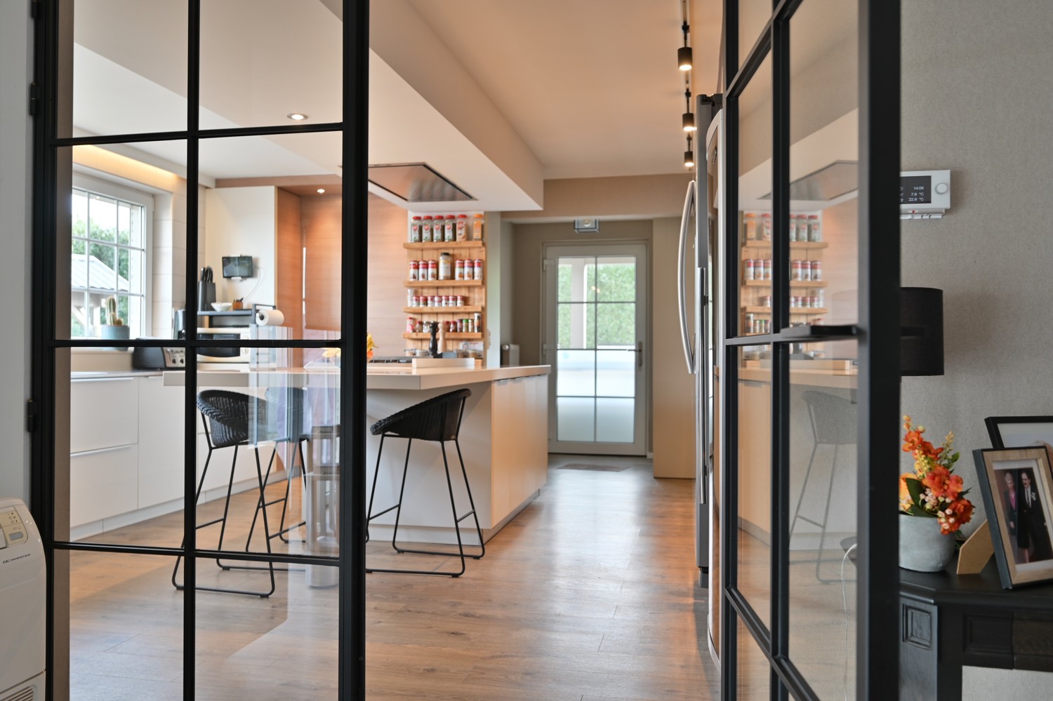 Via de eerste hal met gastentoilet komen we in de zeer praktisch ingerichte keuken met zicht op de koer achteraan. De keuken is afgewerkt met een combinatie van composiet en RVS werkbladen en is volledig uitgerust met hoogwaardige toestellen, waaronder een dubbele Amerikaanse koelkast, een wijnfrigo, een gasfornuis, een vaatwasser, een combi-oven en een Novy dampkap. Vanuit de keuken betreden we via een dubbele zwart stalen glazen deur de ruime leefruimte met een prachtig zicht op het verwarmde zwembad. Aansluitend bevindt zich de zeer royale woonkamer, eveneens toegankelijk via de voorzijde van het perceel. Hier vinden we een apart toilet en een extra polyvalente ruimte van ca. 30 m² aan straatzijde, ideaal als praktijkruimte, kantoor of hobbyruimte. Via een houten trap bereiken we het slaapgedeelte. Onder de dakspanten bevindt zich een sfeervolle slaapkamer met veel lichtinval langs twee zijden. Aansluitend vinden we een prachtig afgewerkte dressing met wollen tapijt en een zeer ruime badkamer met ligbad, inloopdouche, dubbele wastafel en ingewerkte wandkasten. Het geheel wordt vervolledigd met een apart afsluitbaar toilet. De buitenruimte is met dezelfde zorg en kwaliteit aangelegd als het interieur. Aan de achterzijde van het perceel bevindt zich een verwarmd zwembad dat wordt aangedreven door een warmtepomp en uitgerust is met een automatische chloorinstallatie, wat zorgt voor optimaal comfort en eenvoudig onderhoud. Het bijhorende poolhouse herbergt alle technische installaties en biedt extra praktische bergruimte. De voorzijde van het perceel is volledig aangelegd met kleiklinkers en afgesloten met een stijlvolle dubbele smeedijzeren poort, wat zowel privacy als veiligheid garandeert. Naast de ruime oprit bevindt zich aan de rechterzijde een dubbele garage met twee sectionale poorten. Boven de garage is er een zolderruimte voorzien over ongeveer 50% van het vloeroppervlak, ideaal als extra opslag. Bovendien is er een laadpaal-voorziening aanwezig, wat deze eigendom ook toekomstgericht interssant maakt.