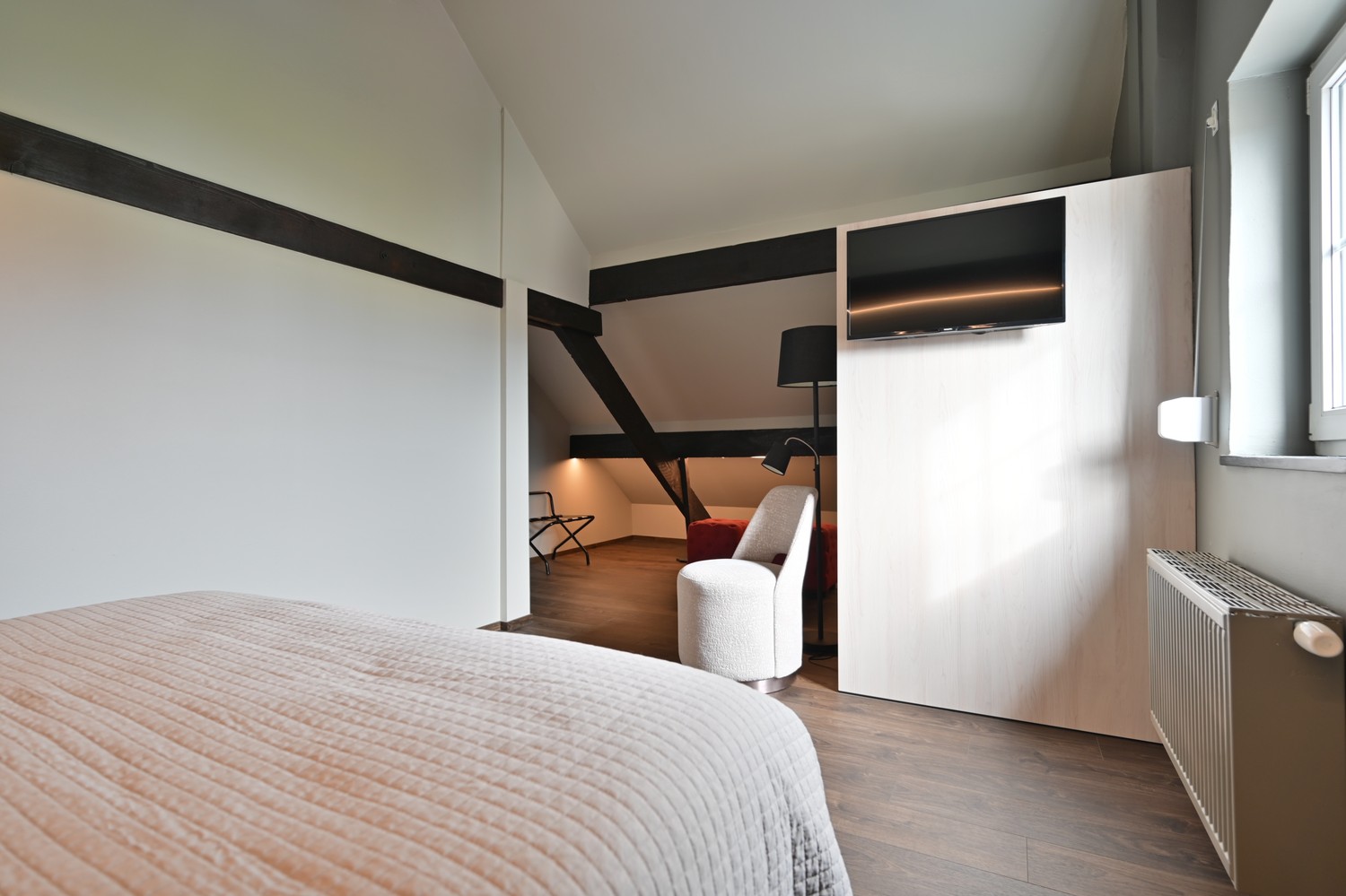 De B&B beschikt over een aparte inkomhal met warme, rustieke materialen en een mooie houten trap naar de verdiepingen. Vanuit de inkom is er een directe verbinding met de ruime eetruimte en de beklinkerde, overdekte koer. De eetruimte is royaal en sluit aan op het overdekte terras en de keuken. Eiken parket en een stijlvolle grijze wandafwerking zorgen voor een gezellige en kwalitatieve uitstraling. Op de verdiepingen bevinden zich drie volwaardige gastenkamers, elk met een eigen badkamer en een hoogwaardige afwerking. Alle kamers liggen onder de karaktervolle dakspanten en genieten van veel natuurlijk licht. Twee kamers zijn afgewerkt met parketvloeren, de derde met kwalitatief vinyl laminaat. De badkamers zijn stijlvol ingericht met marmer en keramische tegels en beschikken over ruime inloopdouches, hangtoiletten en wastafels. Eén kamer biedt daarnaast ook nog een ligbad. Airconditioning, rolluiken en tv-aansluitingen zorgen voor extra comfort. De B&B beschikt over een private parking met drie volwaardige parkeerplaatsen en een aparte garagebox.