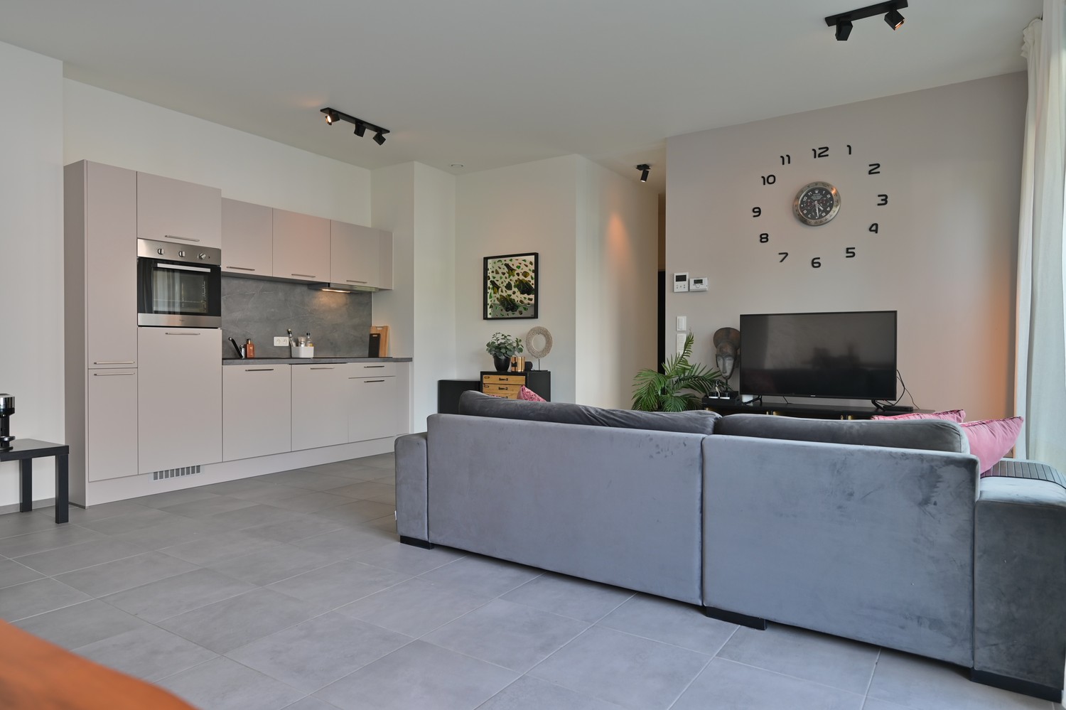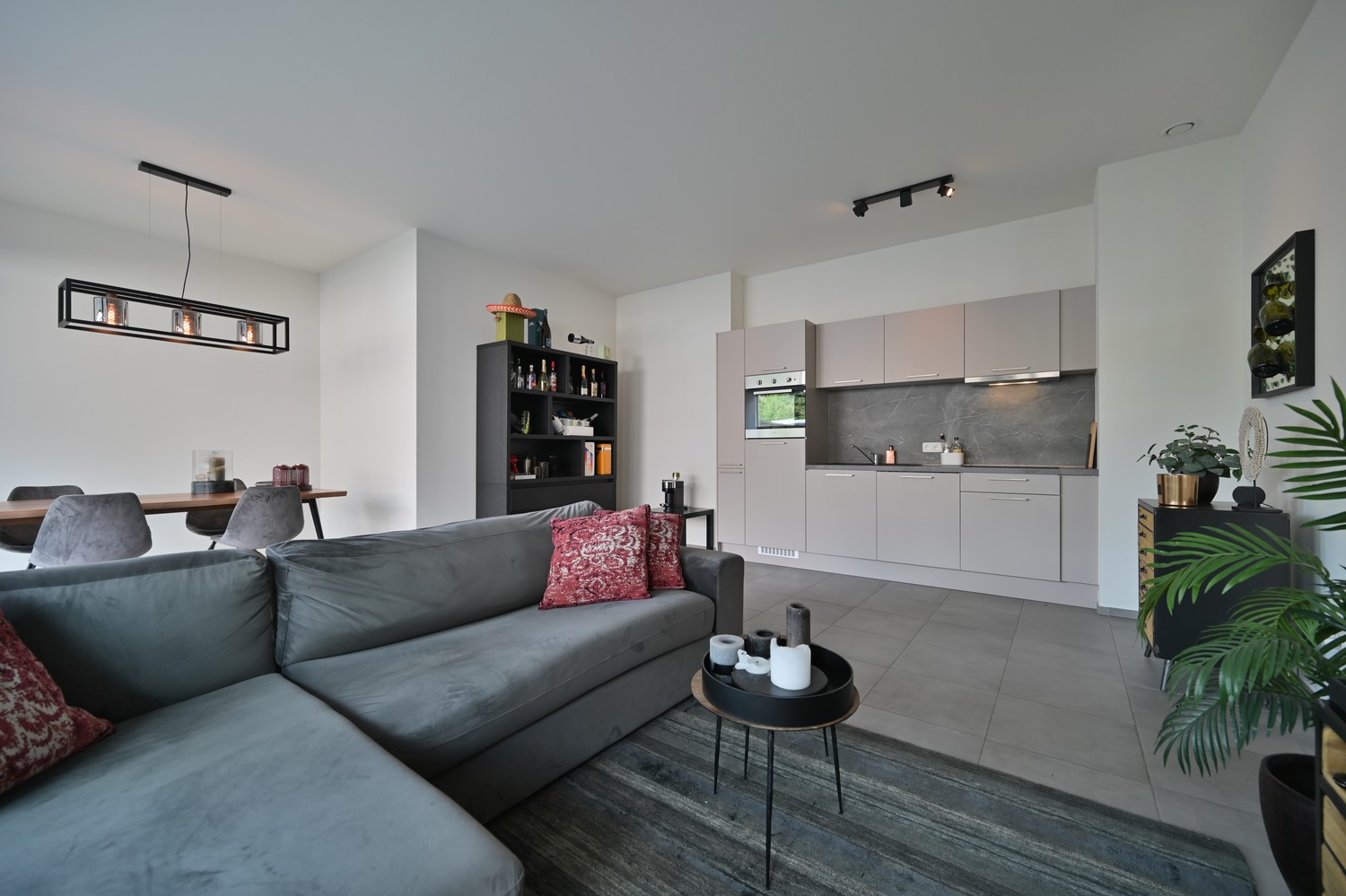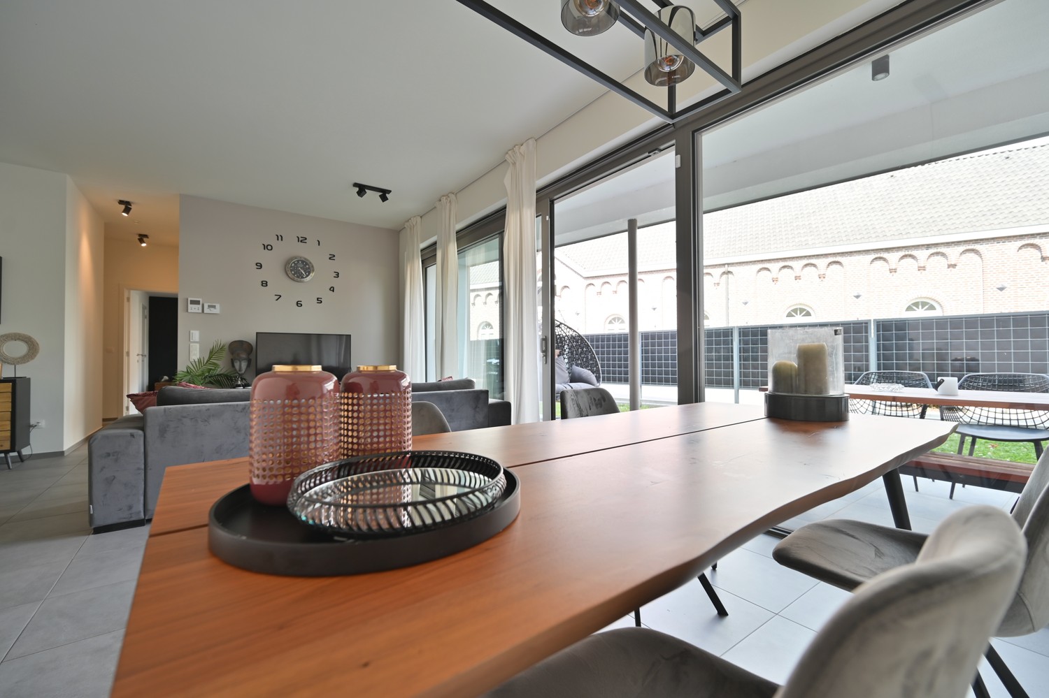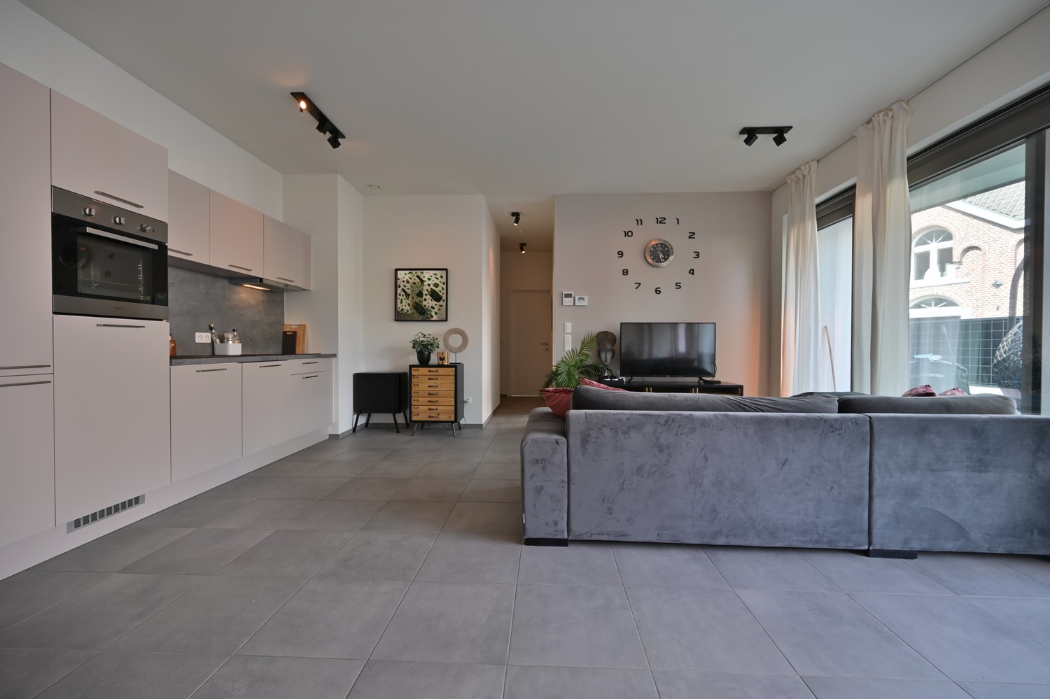 - woonkamer met open keuken en groot raampartijen naar overdekt terras en privétuin