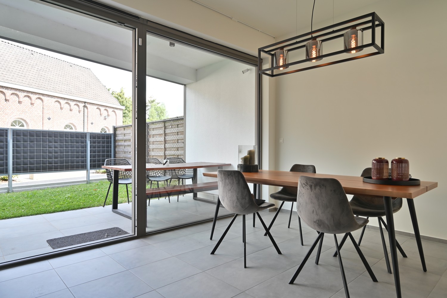- woonkamer met open keuken en groot raampartijen naar overdekt terras en privétuin