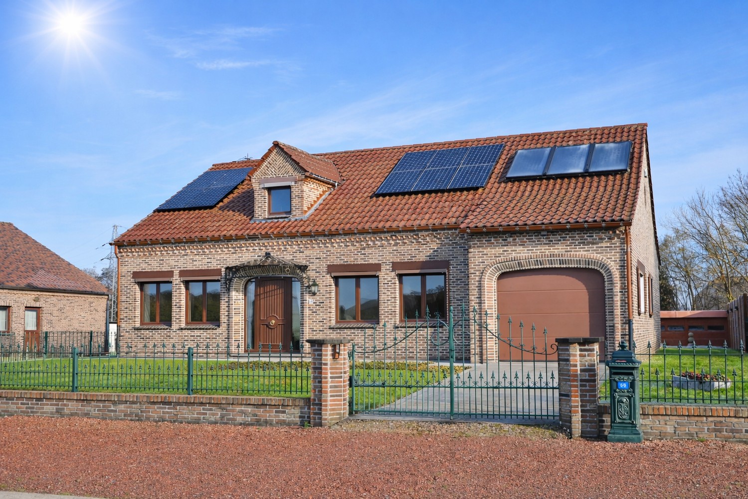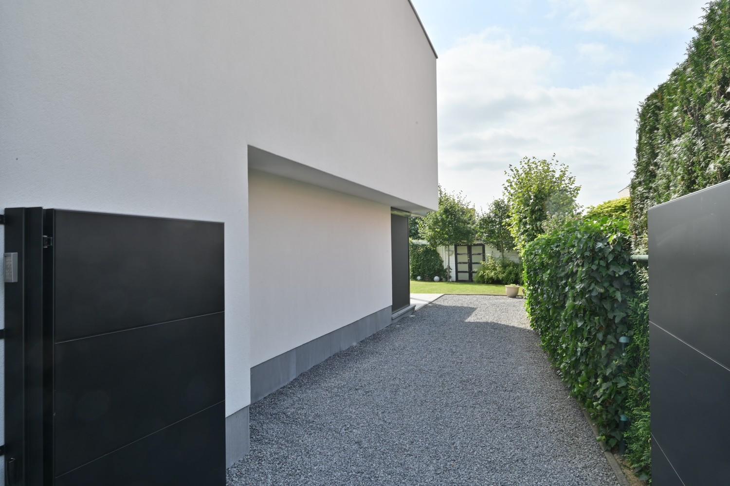 - volledig omheinde tuin met elektrische toegangspoort (rechterzijde) en looppoort (linkerzijde)