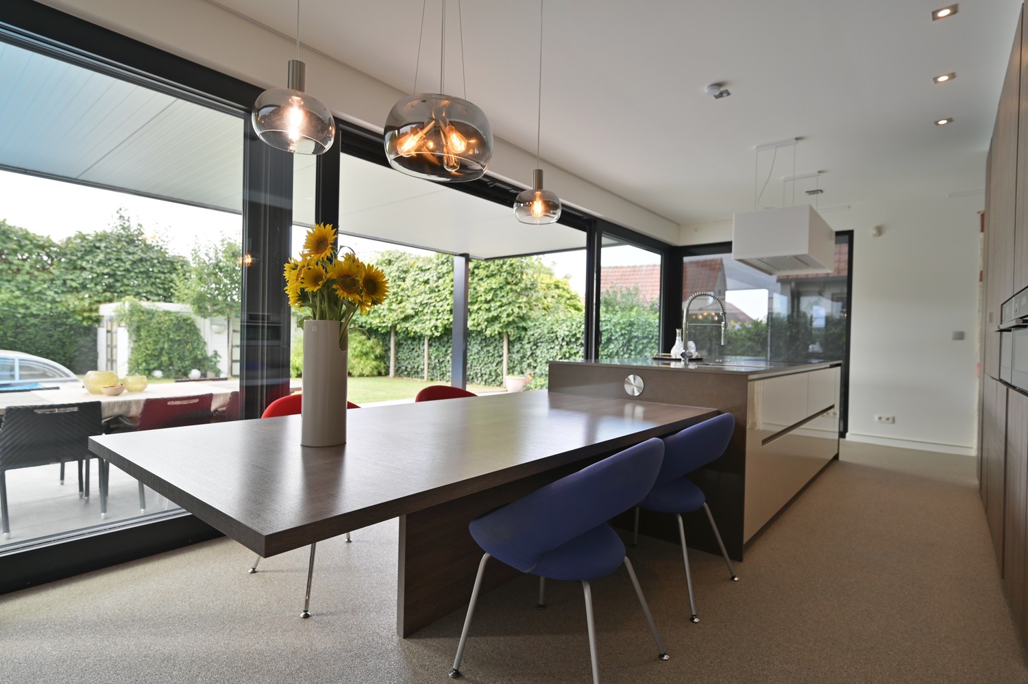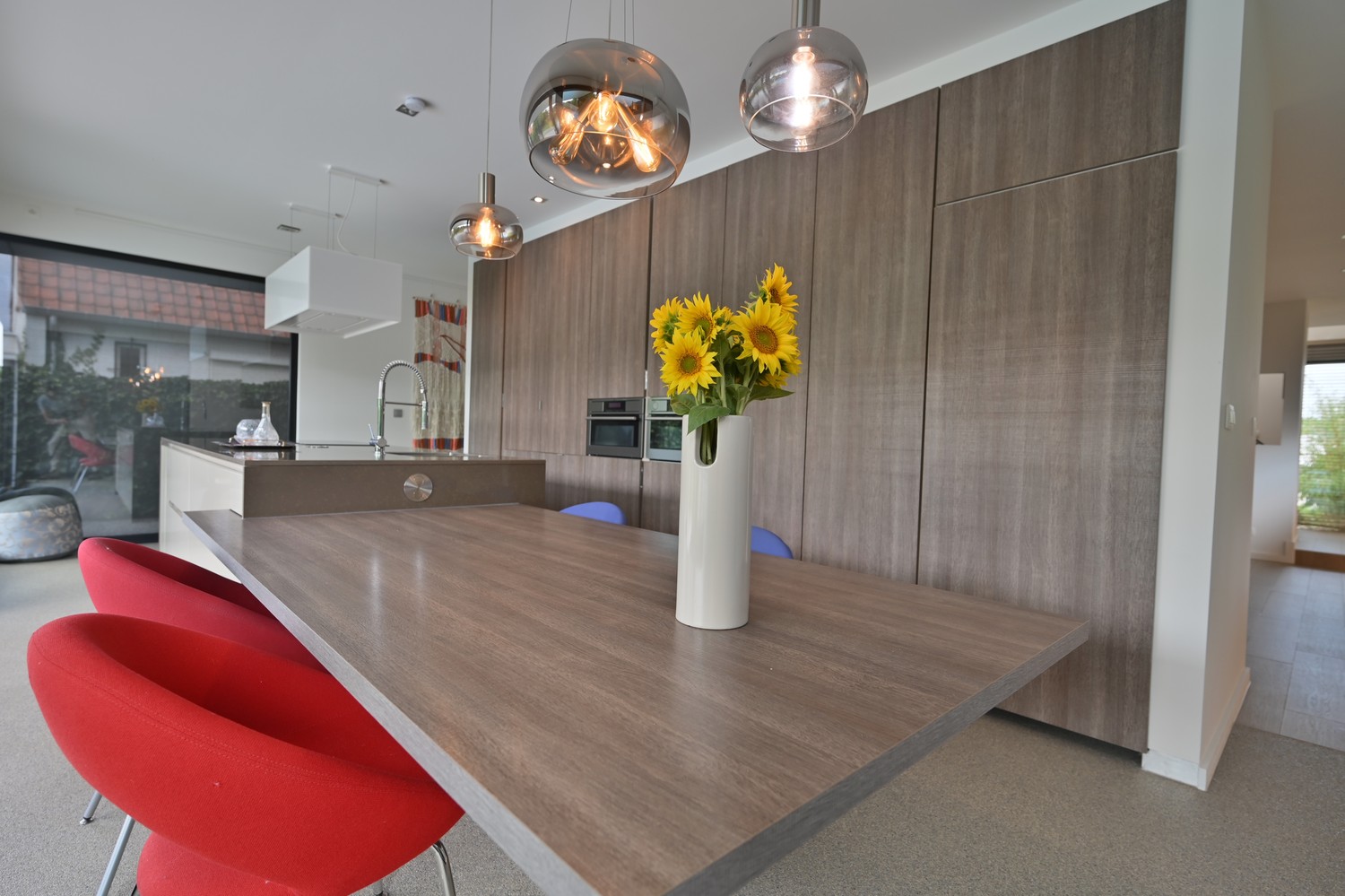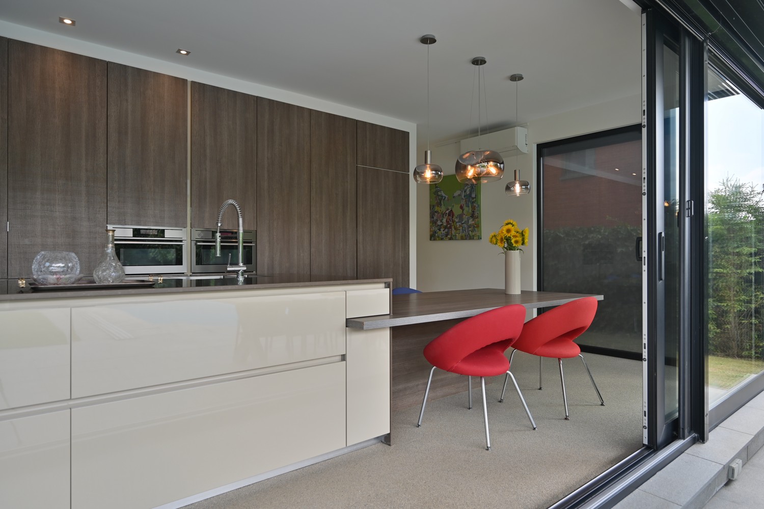 - open leefkeuken (steentapijt) met optimaal tuincontact en voorzien van alle apparatuur (inductie kookplaat met zwevende afzuigkap, combioven, stoomoven, vaatwasser en koelkast
