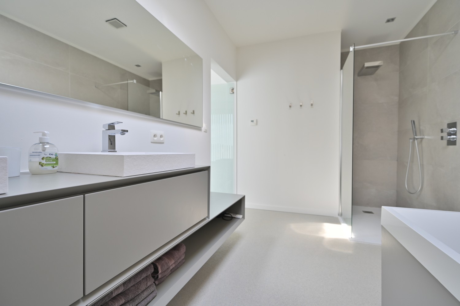 - badkamer 2 voorzien van meubel met wastafel, douche, hangtoilet