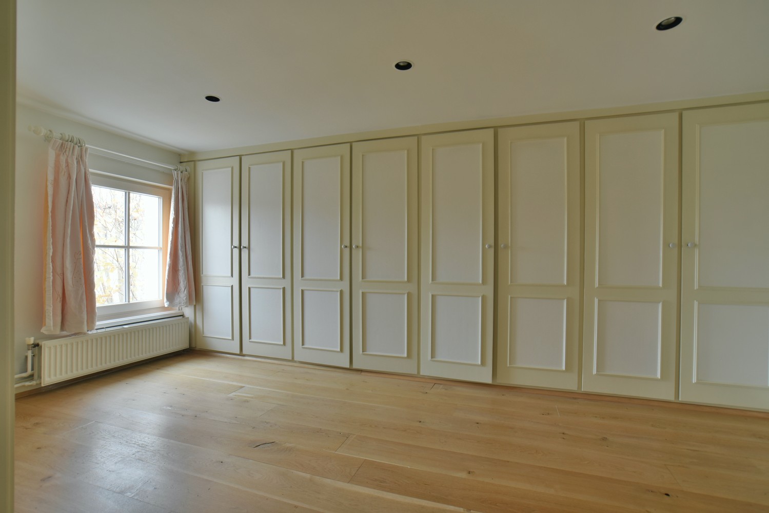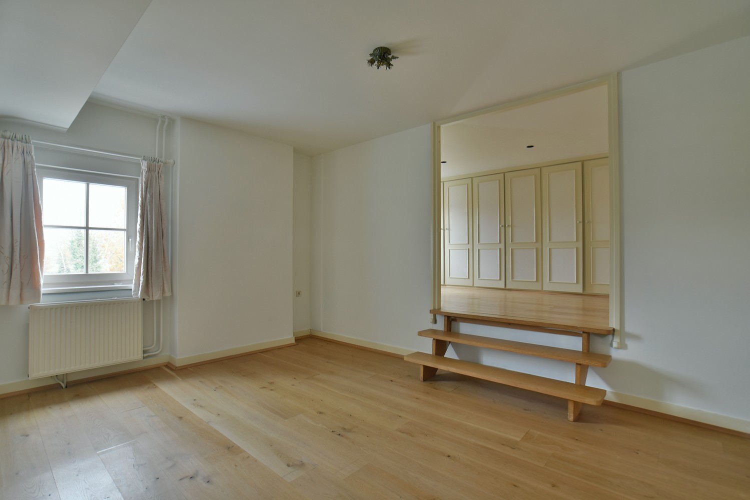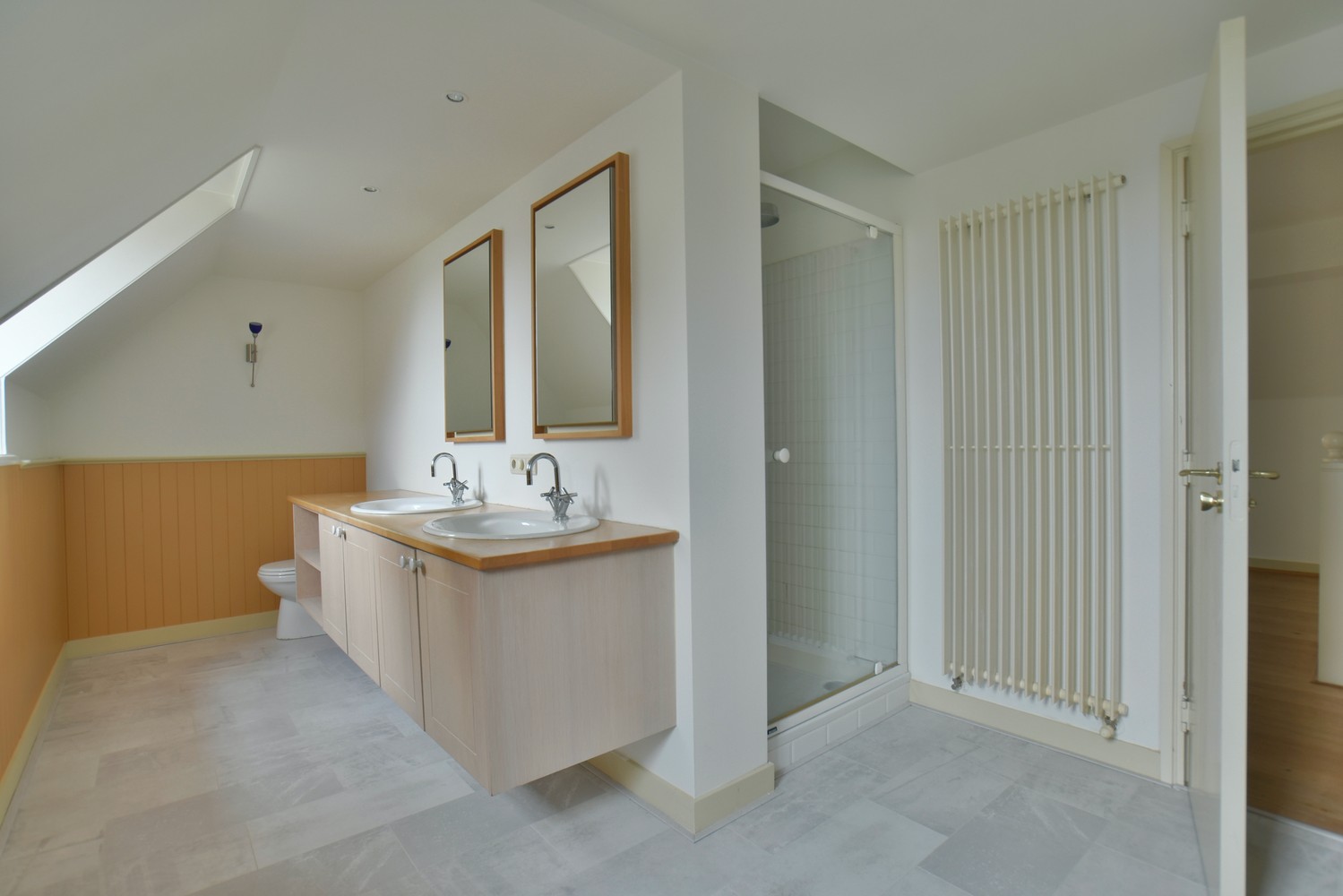 Op de verdieping bevinden zich twee ruime slaapkamers, beide afgewerkt met eiken parketvloeren en voorzien van een dressing. Tussen beide kamers ligt de badkamer met vrijstaand bad, douche en dubbele wastafel.